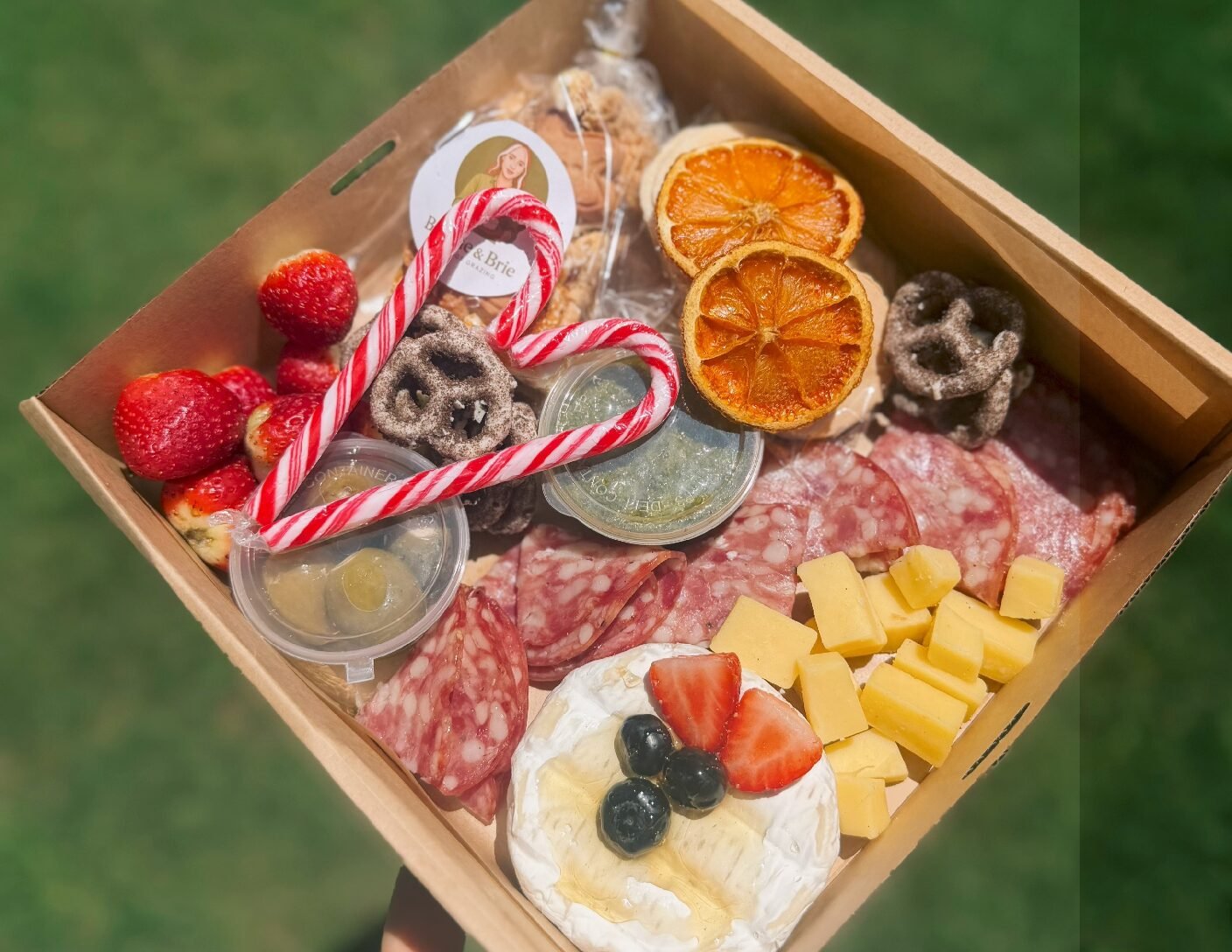 Our Classic Grazing Box includes a delicious assortment of deli meats, specialty cheeses, seasonal fruits, olives, marinated and pickled vegetables, fresh dips, and assorted crackers. It’s a perfect spread for any occasion!